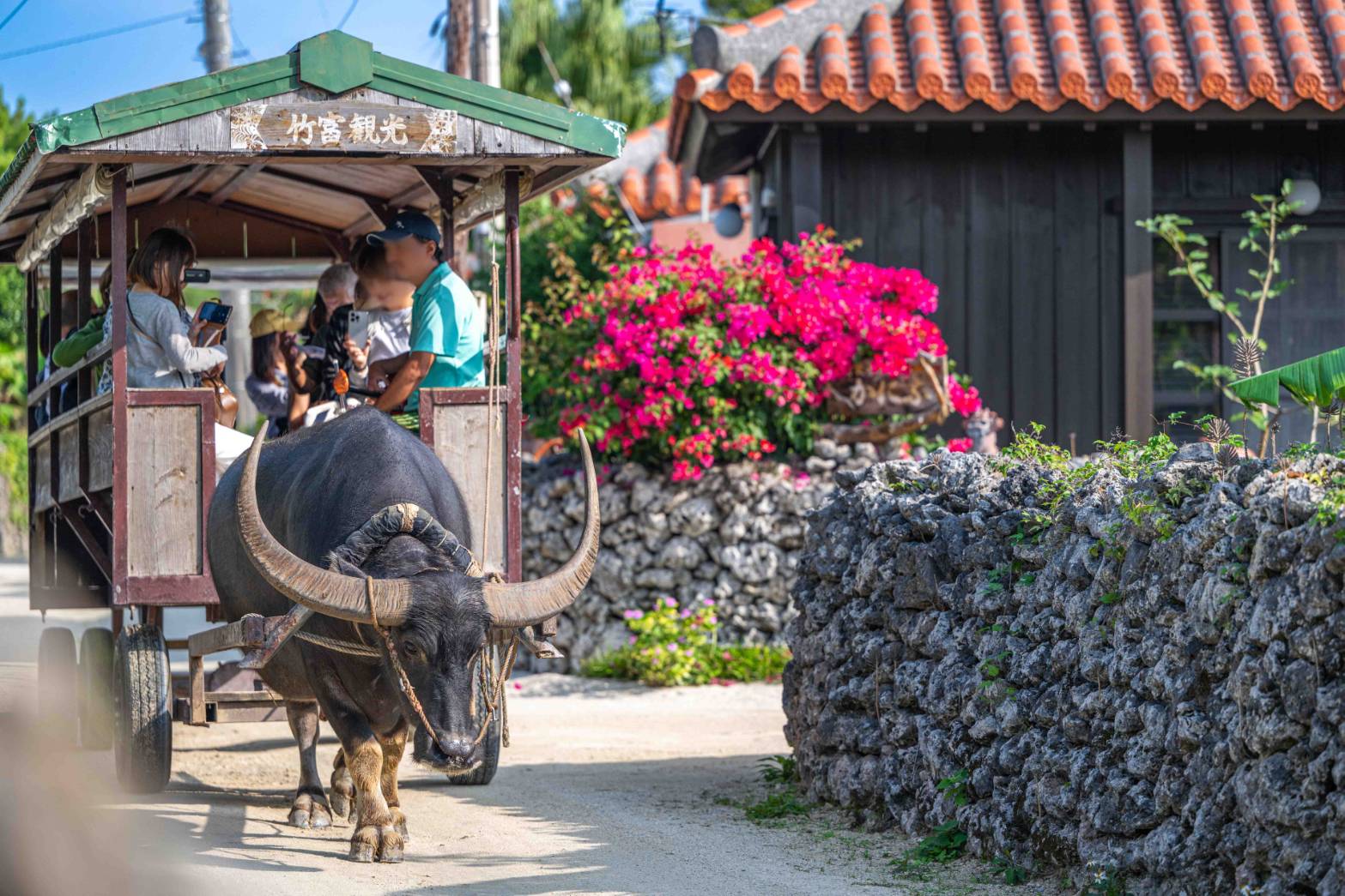 赤瓦屋根の民家が立ち並ぶ集落をのんびり水牛車に乗って観光